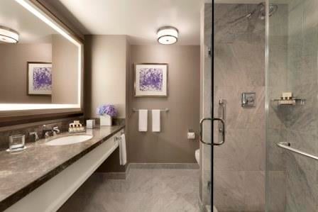 Elegant Pacific Northwest room with marble bath, work desk, and accessibility features.